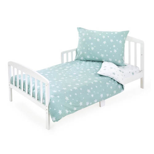 סט מצעים למיטת מעבר רך ונעים למגע | עשוי 100% כותנה | הדפסים של כוכבים בגוון ירוק מעושן | הסט כולל סדין, ציפה לשמיכה וציפית לכרית