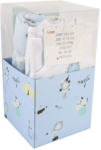 יצרנו עבורך מארז מתנה מושלם בגד גוף לבן ומכנס תואם בצבע תכלת שני חיתולי טטרה מעוצבים ובובה כחולהנארז בקופסה מעוצבת
