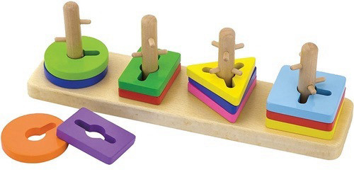 תיאום צורות לפי פינים מעץ מלא מבית ויגה. הצורות כוללות ריבוע, משולש, מלבן ועיגול. על הפעוט לשים את הצורה במקום הנכון גם לפי הפינים שעל גבי המוט. מתאים לפעוטות בני 18 חודשים ומעלה. מידות 30 על 7.5 על 9 ס"מ. עשוי עץ מלא וצבוע צבעים לא רעילים.