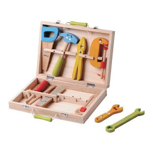 מזוודת כלי עבודה מעץ לבנאים הקטנים | על כלי העבודה הצבעוניים יש פנים חייכניות אשר יעודדו את הבנאים הקטנים והביישנים לשחק בכלי העבודה | מעולה לשיפור המוטוריקה | נהדר למשחקי דמיון | מתאים מגילאי 3 ומעלה.