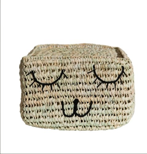 ארגז קש סרוג עם מכסה | עשוי עבודת יד | עיטור רקמת פרצוף כלב שחורה | איכותי ומהמם | 21X15 ס"מ.