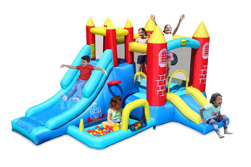 מתנפח איכותי ובטיחותי לשימוש ילדים | טירת קפיצה משולבת עם שתי מגלשות, קיר טיפוס, בריכת כדורים, קליעה למטרה וכדורסל | משקל מרבי מותר עד 136 ק’’ג | כולל מפוח חשמלי | כולל ערכת תיקון | קל לניפוח | כולל 30 כדורים | מתאים לגילאי 3 עד 10 שנים.