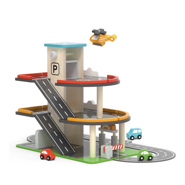 חניון משחק למכוניות 2 קומות עשוי עץ מלא. כולל 3 מכוניות, 1 מסוק, 1 תחנת תדלוק, 1 מעלית, 1 תחנת שטיפה. מתאים מגיל 3 ומעלה. מידות במצב מורכב: 25 על 27.5 על 39.5 ס"מ. נדרשת הרכבה ע"י מבוגר.