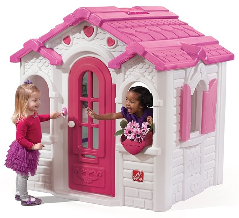 בית משחק ורוד/לבן לילדים הבית המתוק Sweetheart Playhouse של STEP2 ארה"ב יספק לילדים שעות רבות של פעילות ומשחק. הבית מעוצב כמו קוטג’ כפרי עם חלונות נסגרים ונפתחים ופעמון אמיתי.בית משחק מתוק ומרהיב, עיצוב קלאסי עם חלונות (בשני חלונות התריסים נפתחים ונסגרים)פתח בגג לאוורור ולתאורהשולחן מתקפלאדנית פרחיםשעון עם מחוגיםדלת נסגרת ונפתחתטלפון משחקפעמון דלת חשמלי (מצריך 4 סוללות AAA – לא כלולות)גובה פנימי 140 ס"ממתאים מגיל שנה וחצי ומעלהנדרשת הרכבה ע"י מבוגרמידות במצב מורכב: גובה 148 ס"מ / אורך 120 ס"מ / רוחב 135 ס"מ  משקל הבית כ 44 ק"ג  מתאים מגיל 1.5 שנים ומעלה