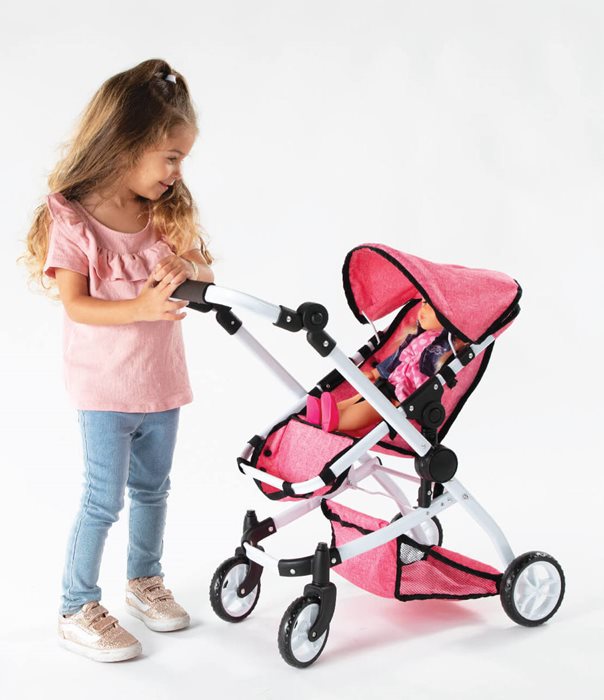 עגלת טיולון לבובה IAM המתקפלת בקלות. מגיעה עם ידית מתכווננת ומרופדת, סל וגגון מתקפל. עגלת בובה איכותית למשחק תפקידים מהנה לפעוט.