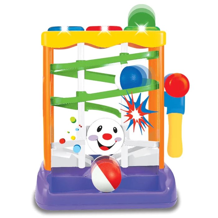 הכו עם הפטיש בכדורים על מנת שיפלו במורד השיפוע, וקבלו תגמול משעשע של אורות וצלילים. הפעוטות מרותקים אחר מסלול הכדור במורד השיפוע ושואבים סיפוק והנאה מרובה מעצם הצלחתם.מעודד פיתוח כישורי קשר עין-יד, התאמת צבעים וסיבה ותוצאה.* מגיע עם מגש לאיסוף כדורים המתגלגלים החוצה. וניתן לשחק עימם משחק חופשי.* מתאים לגילאי 12 חודשים ומעלה.