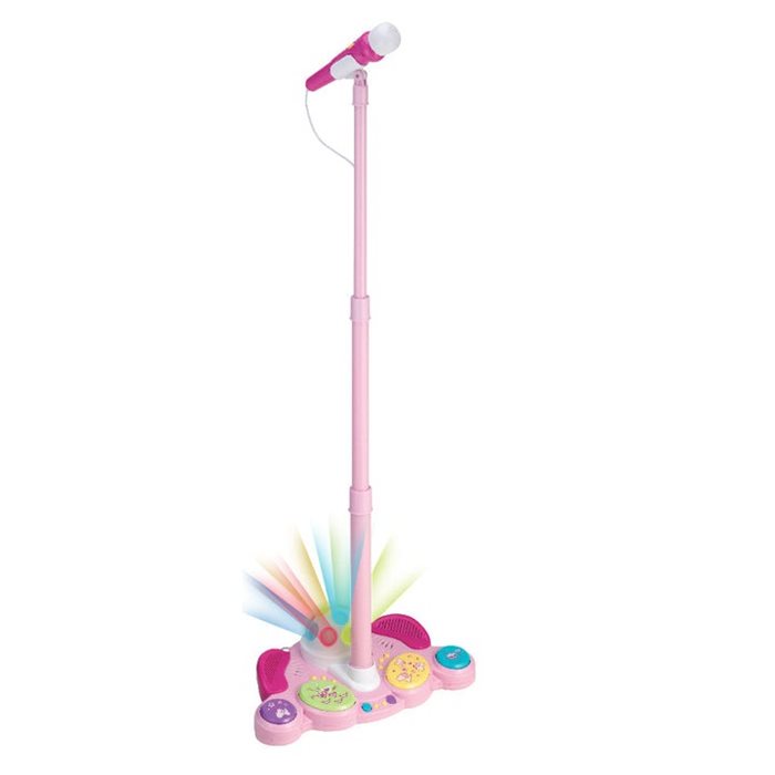 מעמד מפואר למיקרופון, שעל בסיסו 4 כפתורים לשינוי צלילי הנגינה ;כלי נגינה או צלילים מעולם ההופעות על מנת להעצים את חווית הילד בשעת המשחק במוצר. כולל כדור דיסקו המחליף אורות ומיקרופון נשלף.מסייע בפיתוח השמיעה המוזיקלית של הילד.* מתאים לגיל 3 שנים ומעלה.* כולל סוללות.