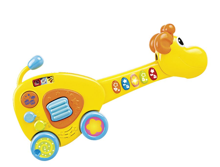 גיטרה 2ב-1 צעצוע גירפהגיטרה לילדים צעצוע ההופכת בקלות מגיטרה לחבר ג’ירף על גלגלים. מגיע עם חוט למשיכה כולל 5 כפתורים מאירים למנגינות שונות. כפתור כרית עם בליטות שהלחיצה בו מדמה פריטה במיתרי גיטרה. צוואר הג’ירף מתכוונן. לגיטרה 3 מצבי נגינה: נגינה חופשית, נגינה עם מנגינת רקע ודמו שירים.