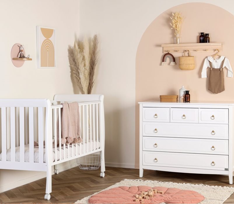 חדר בעל מראה דומיננטי ומושך בייחודו,מציג מראה כפרי רגוע ועדין בשילוב נגיעות זהב. השידה קרן עשויה מ MDF חזק ואיכותי עם גימור צבע וחריטות בחזית ובדפנות, עם חלוקה חכמה ונוחה לשימוש. המיטה קנדה תוצרת איטליה עומדת בדרישות התקן החדש של מכון התקנים עשויה עץמיטת קנדהרוחב: 70 ס”מ עומק: 140 ס”מ גובה: 105 ס”מצבע: לבןתוצרת: איטליה 5 שנות לפי תנאי האחריות והוראות השימושחומר: עץ בוק מלא חזק ואיכותימיטת תינוק המתאימה למזרן סטנדרטי במידה: 63*127, גלגלי המיטה שקטים ומעצור בטיחות ליציבות מלאה.מנגנון מעקה המיטה בטיחותי ונח לתפעול, אינו מאפשר הורדה עצמאית על ידי התינוק אך נוח לתפעול ההורים – ניתן להוריד ולהעלות ביד אחת.3 מצבי גובה למזרן.המיטה עומדת בדרישת התקן החדש של מכון התקנים.אנטי בייט: האנטי בייט הוא פרופיל פלסטי, המולבש בקלות על מעקה המיטה ומונע משיני התינוק לכרסם אותו. הוא עשוי חומר עמיד ועבה. מתאים במיוחד לשלב האוראלי בהתפתחות התינוק.שידת קרןרוחב: 120 ס”מ עומק: 60 ס”מ גובה: 95 ס”מצבע גוף: לבןצבע חזיתות: לבןחומר: MDF מלא איכותי וחזק (כולל פנים המגירות)גימור: צבע בתנור בשילוב חריטות ייחודיות בפלטת השידה ועל חזית המגירות + ידיות קלאסיות בגימור זהב מט ורגליים מעוצבותפלטה עליונה: 2.5 ס”מעומק מגירות: 50 ס”מיציבות מלאה: מוט פלדה מחושלת לחיזוק מבנה השידה לטווח ארוך.אחריות: שנתיים ממועד ההתקנה לפי תנאי האחריות והוראות השימוש.כמו כן ניתן לקבע את השידה לקיר.הסמכת זהב של GREENGUARD למיטות הינה תוכנית מרצון של צד שלישי הבודקת למעלה מ -10,000 כימיקלים ותרכובות אורגניות נדיפות. מוצרים הנושאים את תוית הזהב GREENGUARD בטוחים לשימוש תינוקות.למה זה חשוב?רמת זיהום אוויר בבית יכולה להיות עד פי 5 גבוהה יותר בתוך הבית, וזאת לאור העובדה כי אנשים שוהים 90% מזמנם בתוך הבית.איכות אוויר ירודה בתוך הבית יכולה להשפיע עליכם ועל בריאות התינוק שלכם.כל המיטות שלנו בעלות תוויות אישורי הזהב של GREENGUARD, ונבדקו בקפדנות כדי להבטיח שגם אתם וגם התינוק שלכם נושמים אוויר נקי ובטוח
